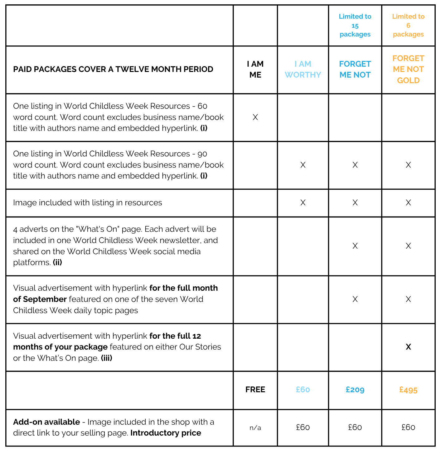 World Childless Week reserves the right to decline or remove any listing or advert (without notice or refund) if the original advertising details change or the proposed material is deemed inappropriate for the World Childless Week audience.