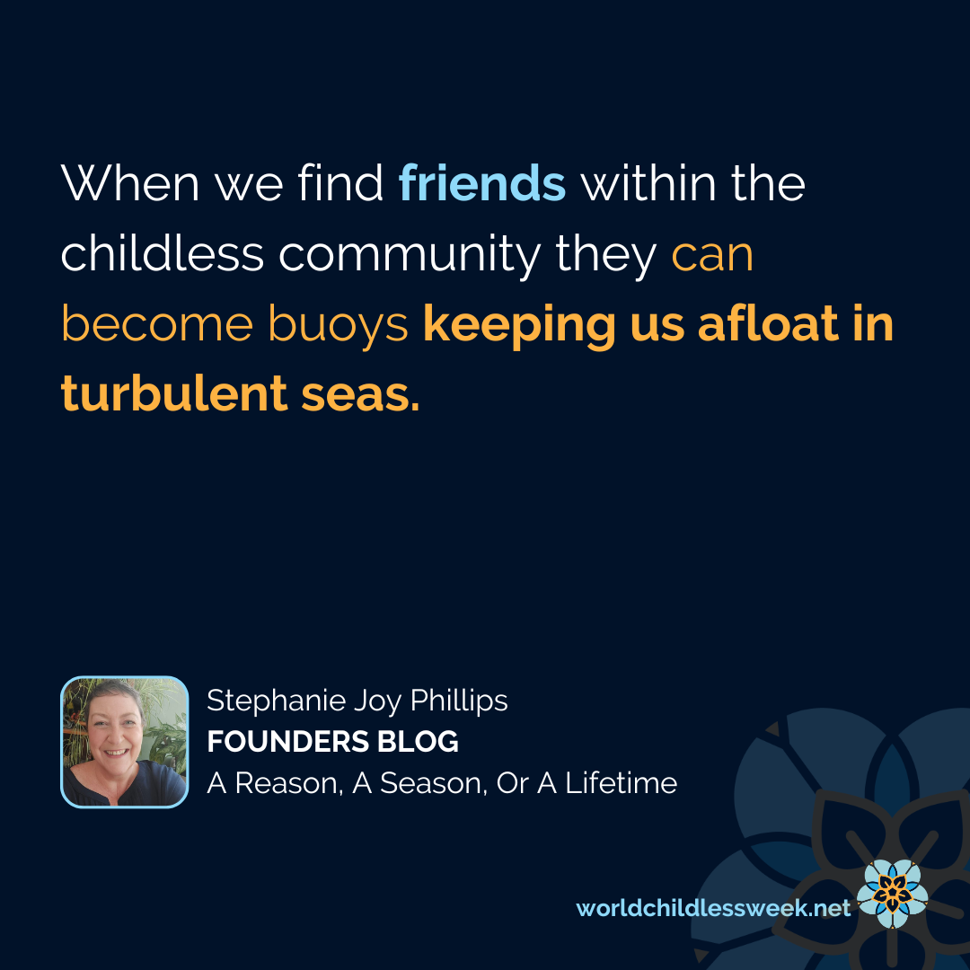 When we find friends within the childless community they can become buoys keeping us afloat in turbulent seas. We connect through our shared grief and the dark emotions. As time goes by we learn more about each other as individuals outside of our grief and whilst it can strengthen our friendships it can also sometimes see us drift apart.