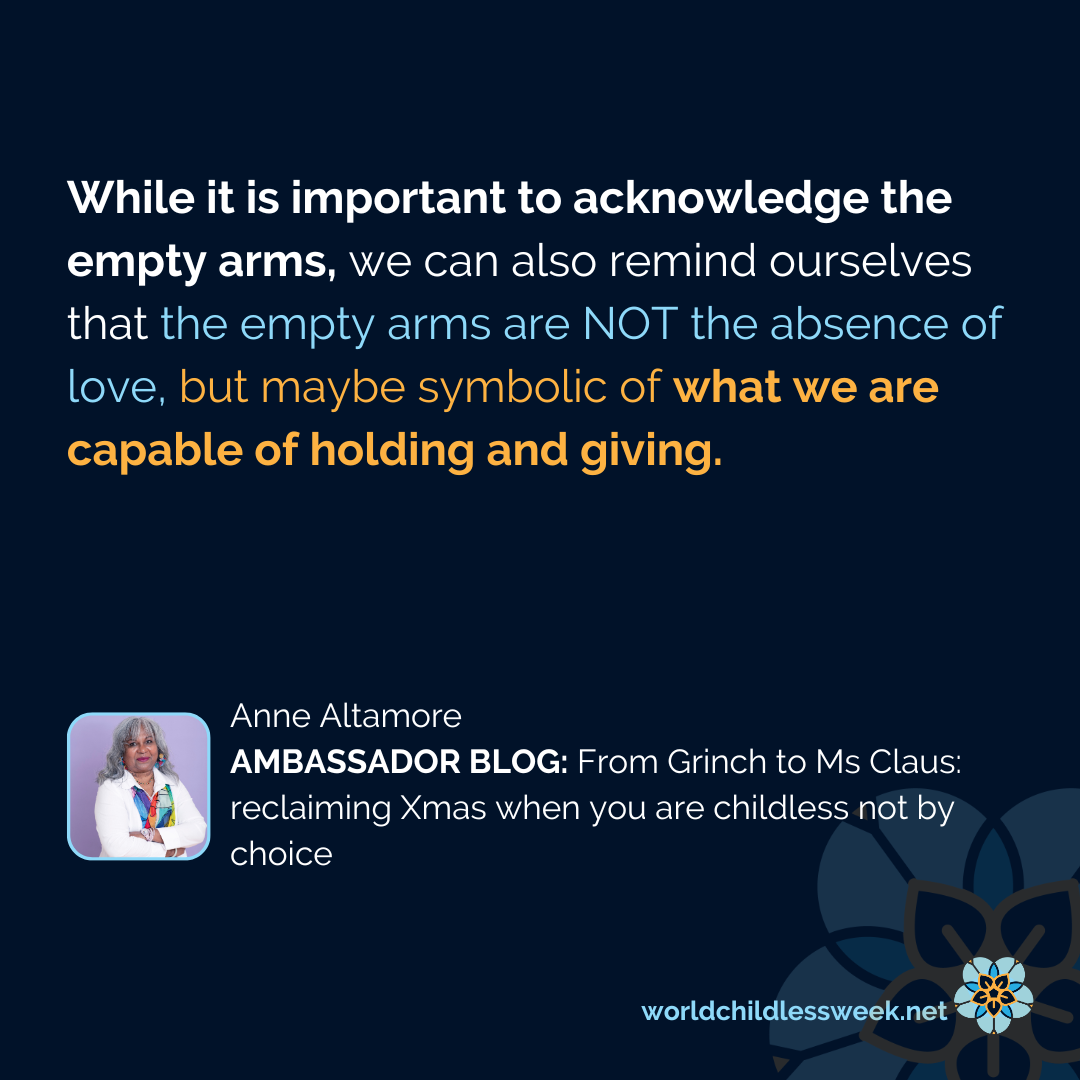 The journey to change is not simple or short, it takes time, effort, and an open and willing heart to reframe the way we view the world. I still have moments where I feel more Grinch than Ms Claus. But now, I know that when the Grinch emerges, it is just a time to acknowledge that it is grief for the dream that did not eventuate, and I just need to rest there for a while and then find the Ms Claus in me. The wise, tender, unapologetically childless woman who has learnt how to hold and honour grief for a life unlived. The same CNBC woman who also knows that the real magic of Xmas is in realising that I have the power to create what I need for peace, joy, love, and hope all year round.