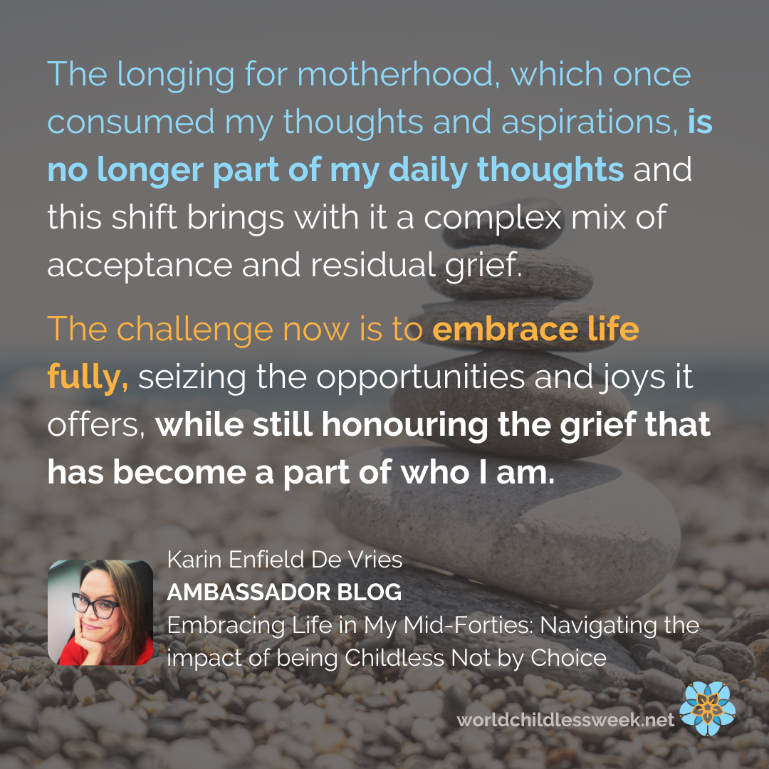 Balancing the act of honouring my grief while embracing life requires mindfulness and intentionality. It’s about giving myself permission to feel the sorrow when it arises but not allowing it to dictate the entirety of my experience. It’s about recognizing that my life, though different from what I once envisioned, is still rich with potential and beauty. This wasn’t easy, in fact it was tough as I didn’t choose to not have children.