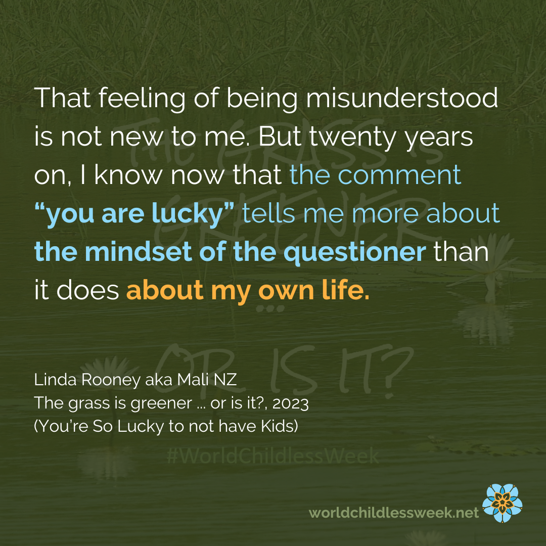If I’d been told 20 years ago that I was lucky to not have kids I would have been angry. Such a comment ignores what I have lost, minimises it, dismisses it. I’ve long known that most people don’t see our losses, ever since a friend said, “but you never had anything, so you haven’t lost anything,” as I was recovering from my second ectopic pregnancy. That feeling of being misunderstood is not new to me. But twenty years on, I know now that the comment “you are lucky” tells me more about the mindset of the questioner than it does about my own life.