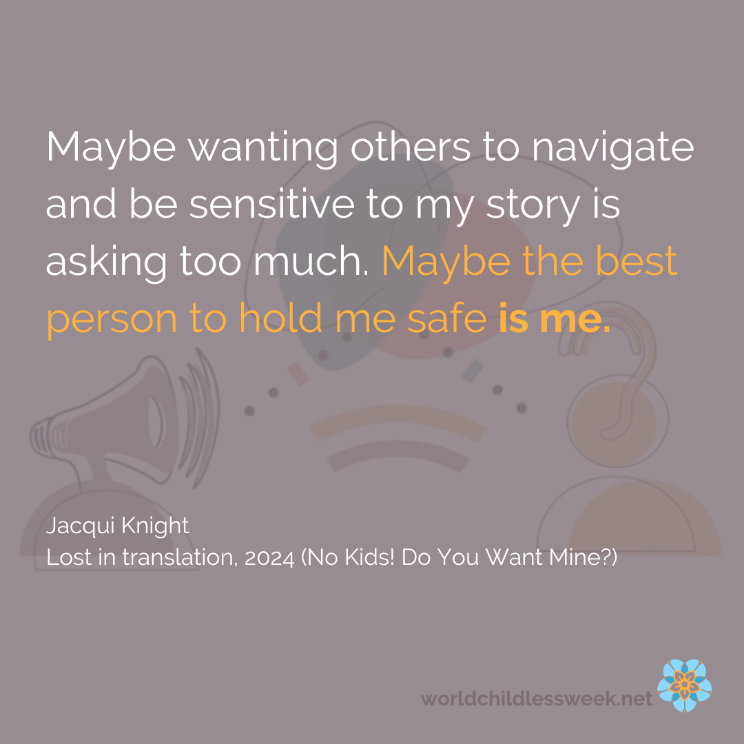 The challenge, of course,is that every one of our stories is nuanced and in some way hidden. Am I therefore expecting too much from the person with children to know how it is for me, when how it is for me is so different to how it is for the next childless or childfree person. Maybe wanting others to navigate and be sensitive to my story is asking too much. Maybe the best person to hold me safe is me.