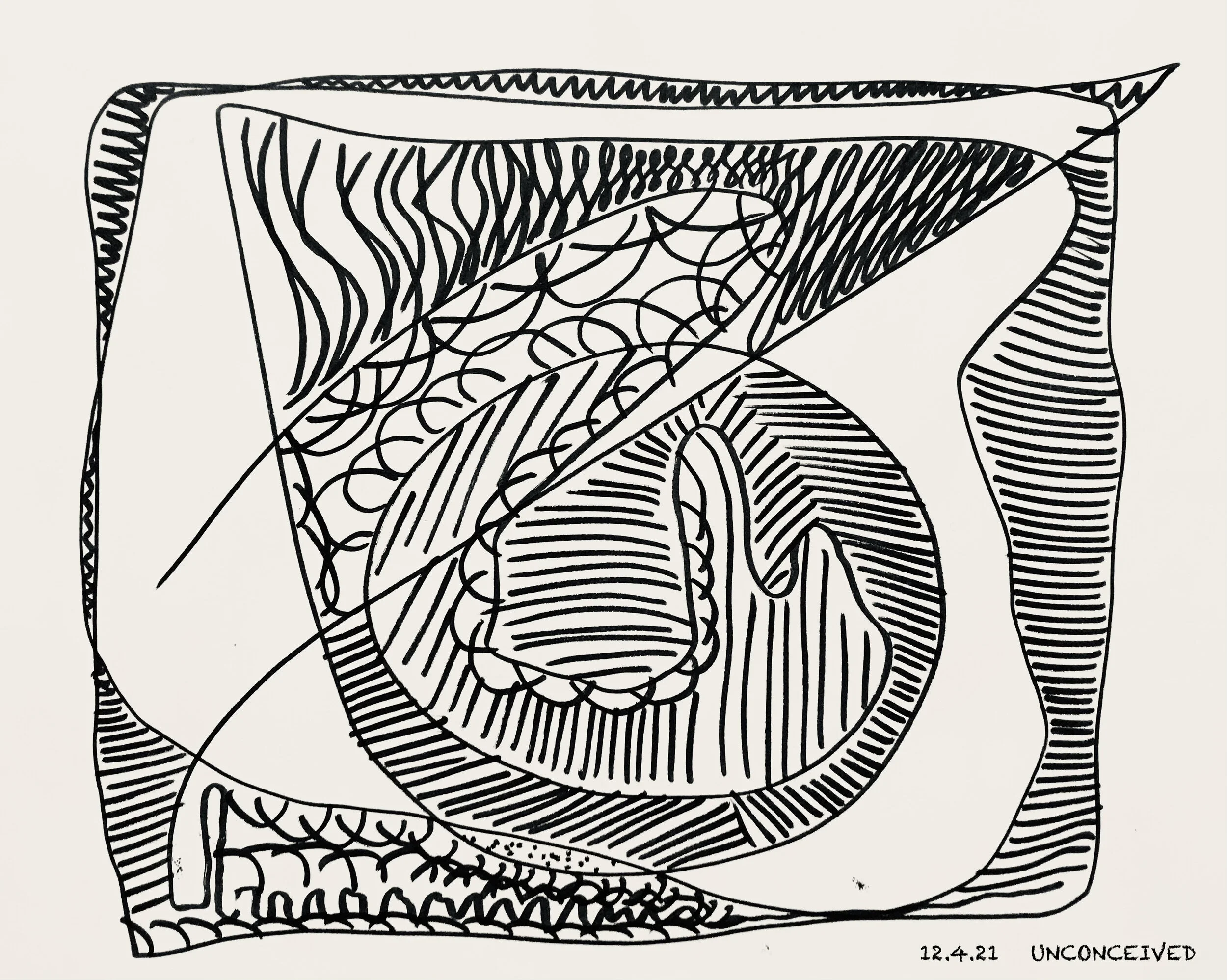 While drawing I felt a sudden physical resistance as I recognized the fetal contours emerging as a center piece. Despite the tears I let my hand complete whatever needed to be completed. The colors of black and white resembling an ultrasound image I never saw? The colors of black and white how very well representing my grieving emotional state. A square-shaped home instead of a red, warm, round and nourishing environment? Or does it still try its best to protect what was planted inside.
