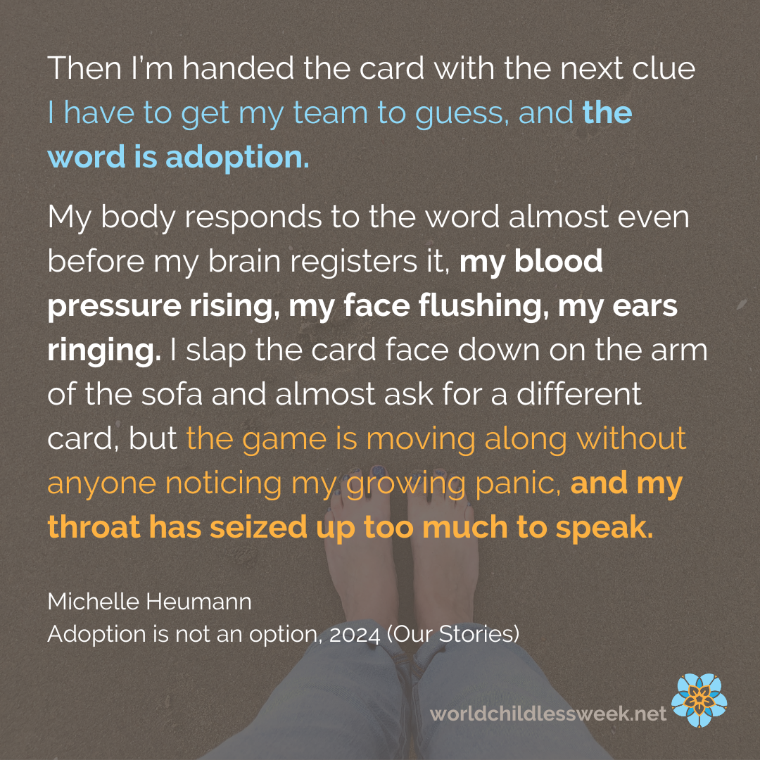 Who knew that such a simple word could have such power over me? But after years of fending off the casual assumption that being childless-not-by-choice is easily solved by adoption, it’s not a simple word – it’s an arrow carrying a payload of trauma, and the wave of anxiety breaking over my head at the appearance of this word suggests that, despite me telling a friend just that morning that I was doing pretty well, I am not as ok as I thought.