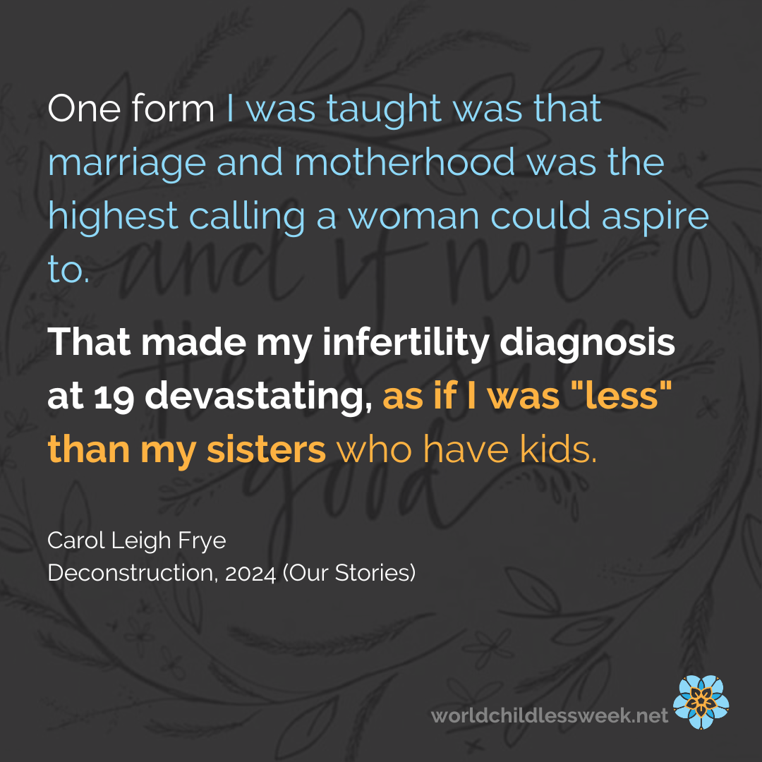 One form I was taught was that marriage and motherhood was the highest calling a woman could aspire to. That made my infertility diagnosis at 19 devastating, as if I was "less" than my sisters who have kids. The reality is, infertility made me so much more than my sisters could be. I was my grandfather's caregiver at the top of my CNA career, a privilege they never got. I had other patients who stole my heart and broke it when they died. I was available for many blessings because of my childless status.