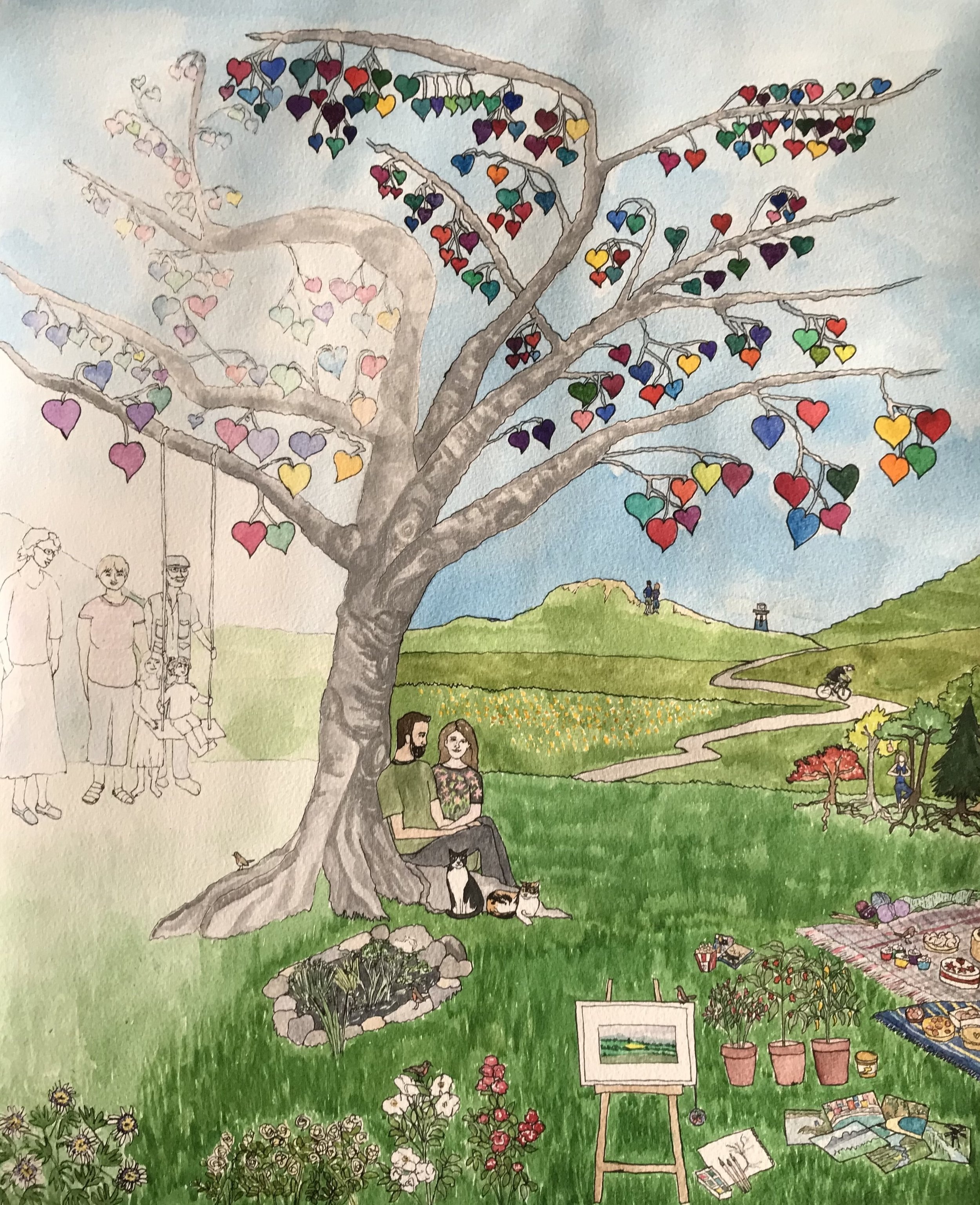 A couple of months ago, the image came to me in the middle of the night, and I sleeplessly composed it in my head. It is called Room in my heart. A tree, with branches and leaves for the loving and special relationships in our lives, ancestors past, friends and loved ones present, and the colour and richness they bring. Looking out from its shelter, the bright and joyful things which fill our lives (some of which might not have been possible if life’s road had taken that other fork, and we had become parents). Our cats are with us – though one has very recently passed over to the other side, but I couldn’t bring myself to move her in the painting.