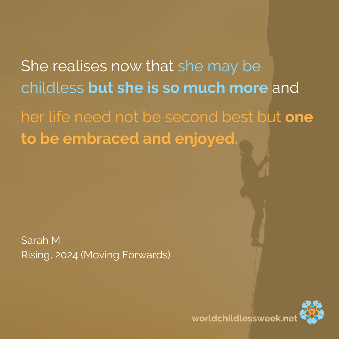 She began to feel that there was a purpose to her life. It was not the life she had expected. She still dips. She still has griefy moments. As she nears her seventh decade, she thinks more about life as an elder childless woman and what that may hold for her but she no longer feels so scared. She no longer feels so very alone because this ‘Club’ , the club she did not want to join has in fact been integral to her healing journey. She has found her tribe and with that has come a sense of belonging and a new found confidence. She realises now that she may be childless but she is so much more and her life need not be second best but one to be embraced and enjoyed. When she looks back she cannot believe how far she has come.