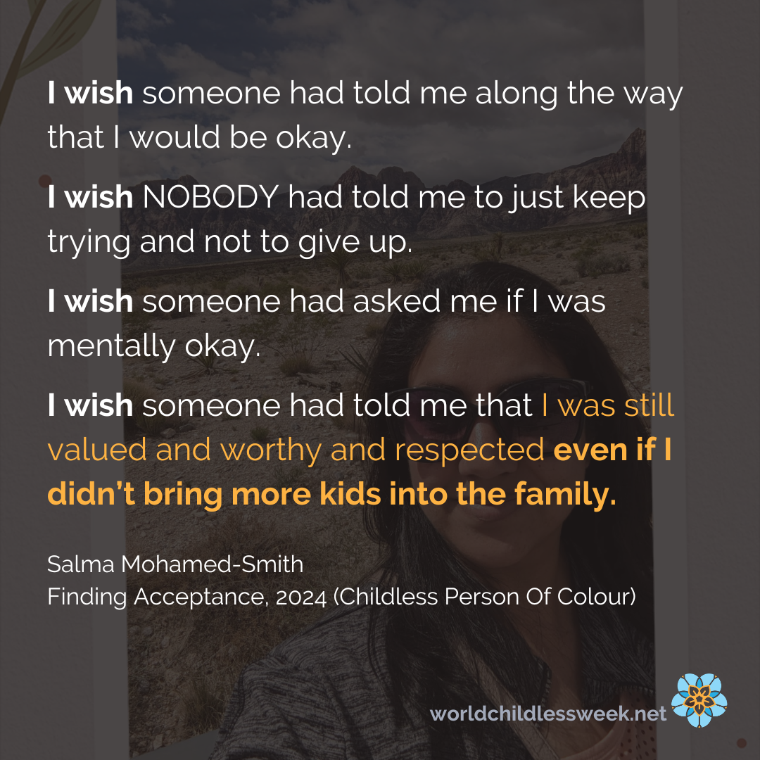 Your family starts to treat you differently. You start to feel unrelatable, like you don’t belong. You have a unique perspective of the world but your family is either uninterested or unable to see it. Instead, the only thing you get from them, especially your parents, is this sense of disappointment and failure…you already have it because your body didn’t do what it was supposed to, but now there’s the fallout with your family to deal with. Since stopping infertility, the dynamics have shifted. The conversations have stopped. The sharing has stopped. The interest in my life in general just…stopped. I wish someone had told me along the way that I would be okay. I wish NOBODY had told me to just keep trying and not to give up. I wish someone had asked me if I was mentally okay. I wish someone had told me that I was still valued and worthy and respected even if I didn’t bring more kids into the family.