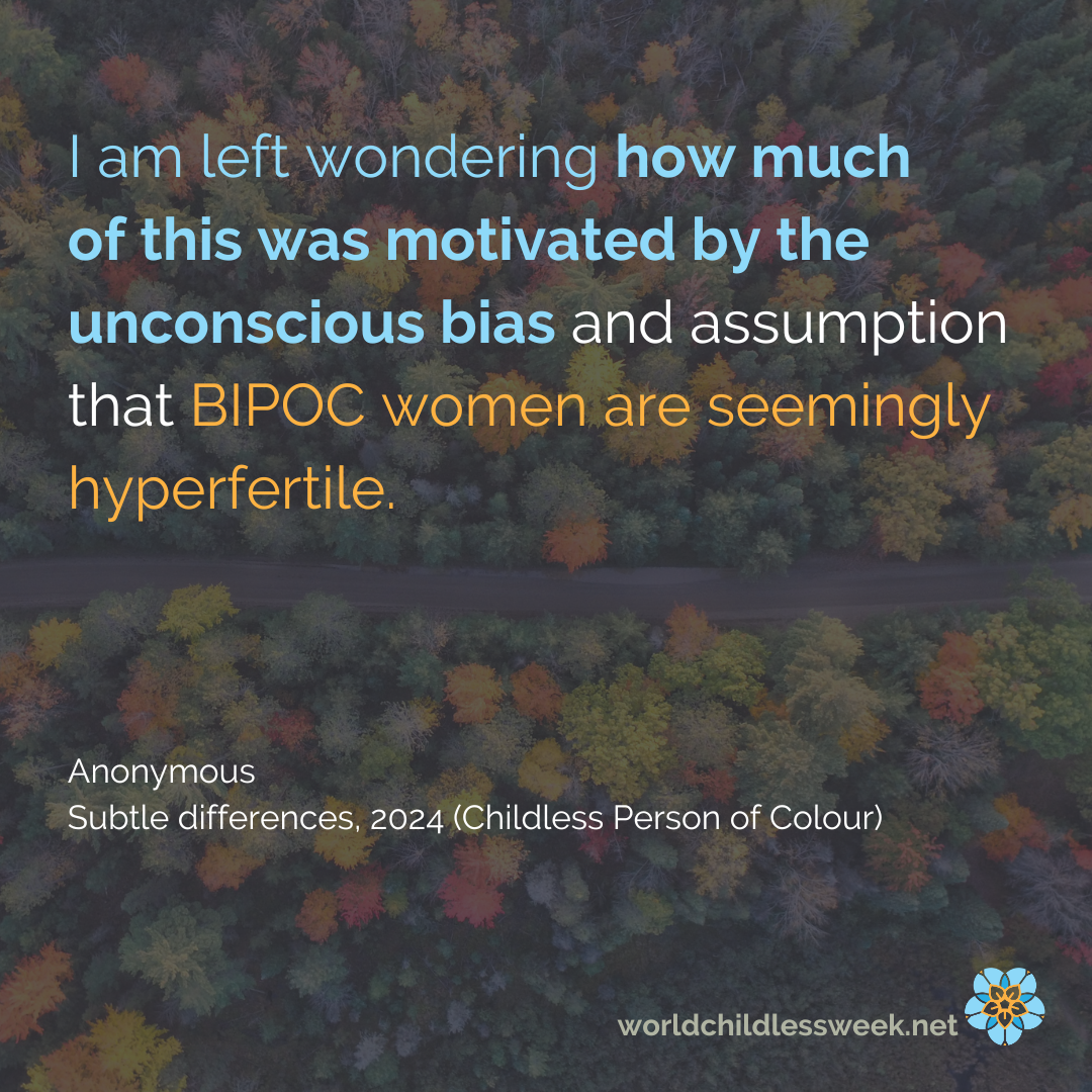 One BIPOC person speaking up or writing is not able to represent all the diverse groups. This can oddly be the expectation in society which is not quite the same expectation for our white Childless not by choice peers. It's a burden for us BIPOC and the mental load is fatiguing laced with the undercurrent legacy of trauma. Sometimes I observe the zoning out or switching off when a BIPOC expresses their lived experiences in our dominantely white centric childless communities. Disappointing as it is its also unintentional.