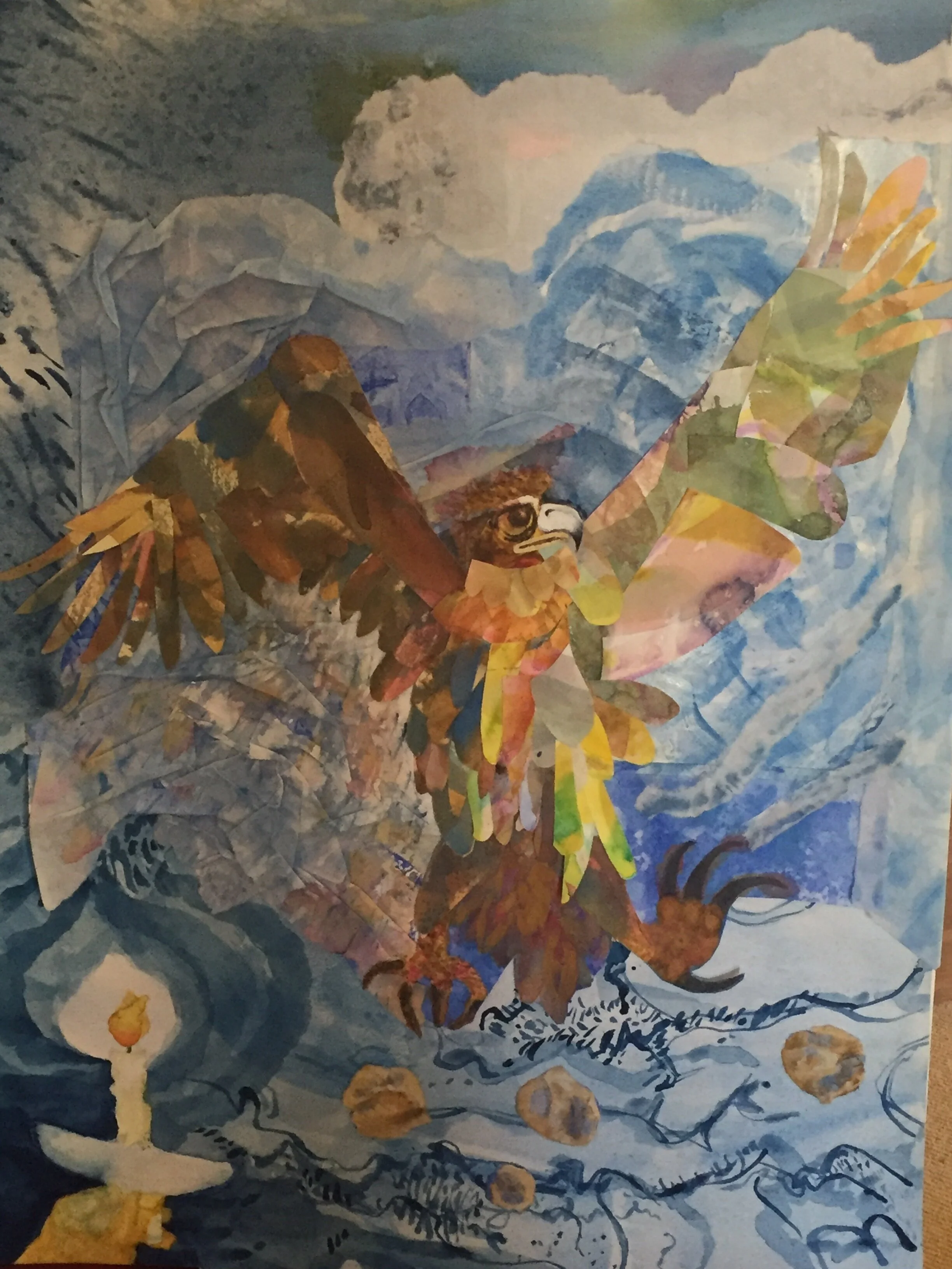 I’ve been working on a watercolour and collage piece about an encounter with nature I had in my late 30s. I had climbed a mountain and was resting with my back against a rock admiring the view when a Wedgetail Eagle landed just above my head. It had flown up from the other side. As its head came forward over its talons it saw me for the first time and before completely settling, it took off again. It was all over before I even realised that I’d been so close to a wild bird of prey.