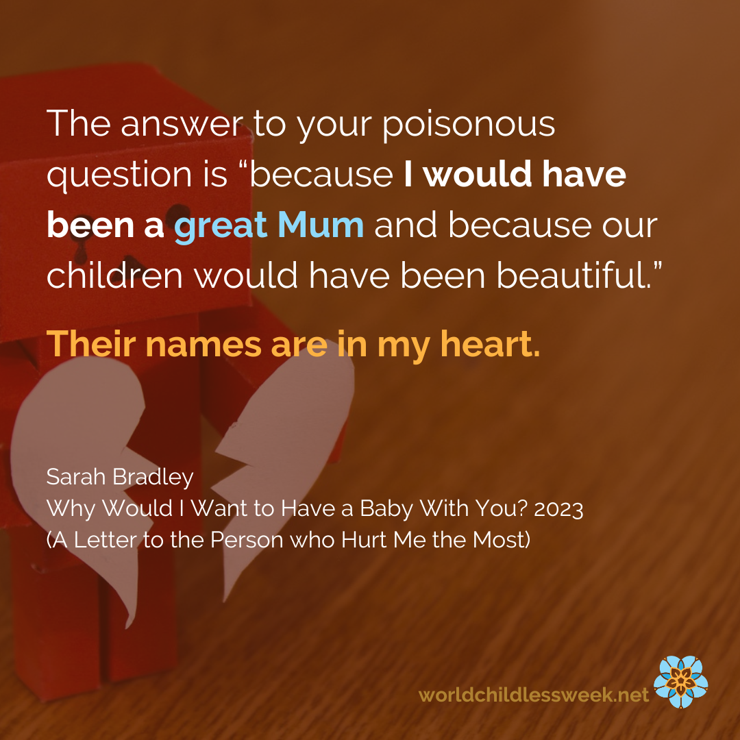 The answer to your poisonous question is “because I would have been a great Mum and because our children would have been beautiful.” Their names are in my heart.