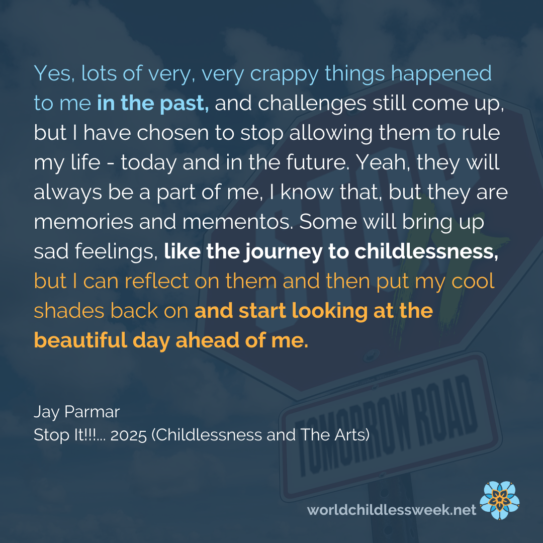 Yes, lots of very, very crappy things happened to me in the past, and challenges still come up, but I have chosen to stop allowing them to rule my life - today and in the future. Yeah, they will always be a part of me, I know that, but they are memories and mementos. Some will bring up sad feelings, like the journey to childlessness, but I can reflect on them and then put my cool shades back on and start looking at the beautiful day ahead of me.